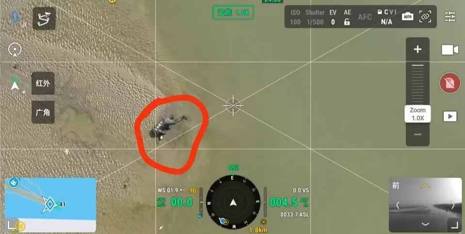 老人所在的地点离大家的直线距离接近2公里,为了能最快速度找到老人,高东立即操作无人机飞向出发点,为地面救援组充当“导航员”。在车辆行驶到距离老人还有300米时,3辆救援警车中有2辆都陷进了沙地,大家只好下车步行,深一脚浅一脚地向老人跑去,冰冷的泥浆瞬间没过了小腿,所有人的皮鞋和裤腿都灌满了泥沙,但他们顾不上这些,以最快速度来到老人身边。